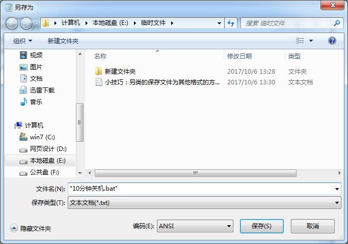 首先和正常一样进入到保存文件的界面,这时候如果保存为其他文件格式的话不需要再找对应的格式了,直接在输入文件名一栏输入 文件名.后缀名 并用英文状态下的双引号包含起来 如保存为 10分钟关机.bat 就是输入 "10分钟关机.bat" 回车你就会发现在保存的位置出现了自己想要保存的类型文件了。不用考虑下面的文件类型到底是什么,这里需要注意的是一定为英文状态下的双引号。