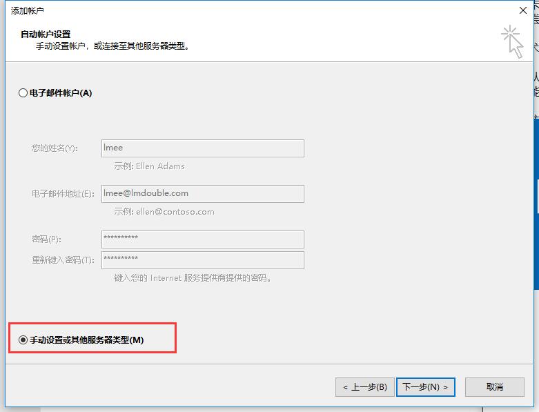 具体为返回至“上一步”,选择最下面的“手动设置或其他服务器类型”,进入到手动配置Outlook邮箱账户的环节。