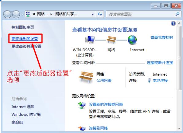 2.在新出现的界面左侧点击“更改适配器设置”打开。