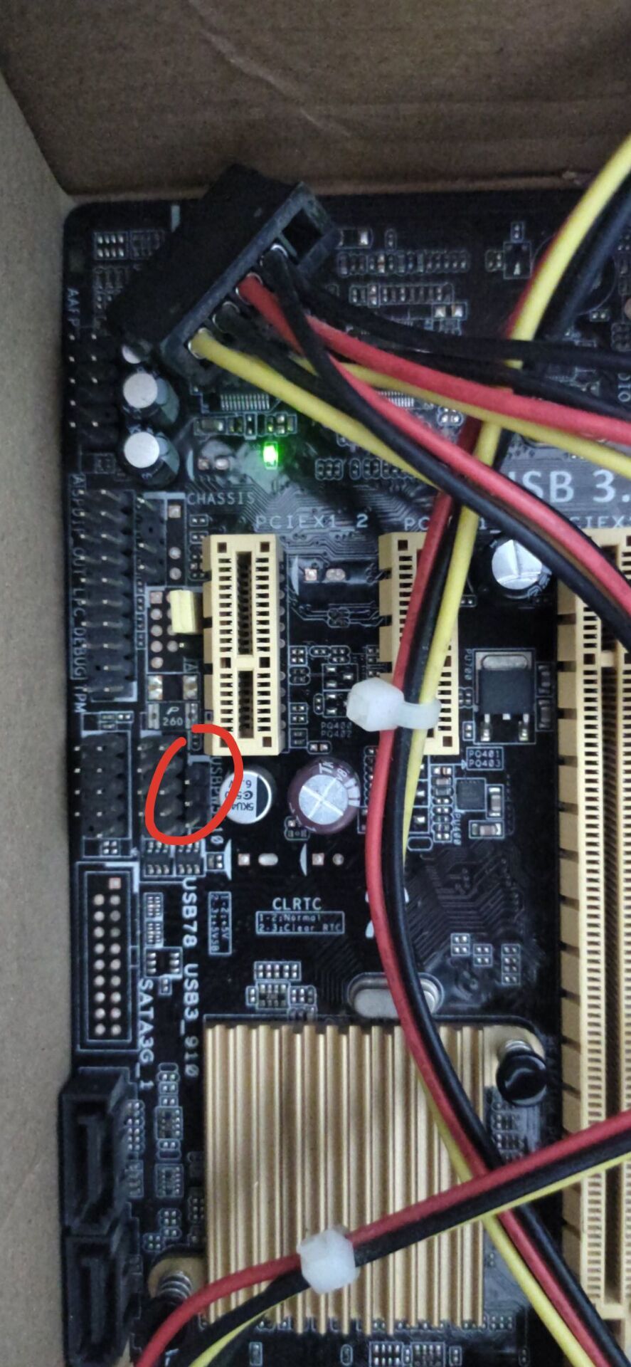 根据图中提示的关键信息“USB Device over current status Detected!!”,可以看出问题出现在USB设备上,但是经朋友排查确认USB设备上没有任何问题(USB键盘,USB鼠标,U盘等设备有问题时也会出现这样的提示),这说明问题肯定出现在主板上了。经过网上查找资料发现,原来是主板上的USB模式跳线帽没了,如下图所示: